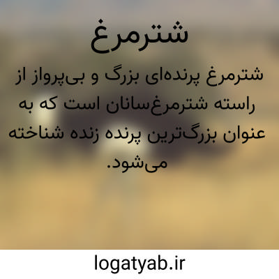 ( ~. مُ ) (اِمر. ) = اشترمرغ: پرنده ای است از راستة دوندگان که بلندی اش تا ۳ متر می رسد. این پرنده دارای بال های کوچک است که هیچ وقت برای پرواز به کار نمی رود. وی به سرعت می دود و مادة آن در طول عمر فقط ۲٠ تخم می گذارد.