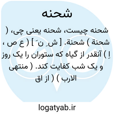( اسم ) ۱ - داروغه پاسبان شهر و برزن نگهبان. ۲ - حاکم نظامی. ۳ - ماموری که از طرف اداره دسته ای از ایلات و عشایر بود. توضیح این کلمه را معمولا به فتح اول تلفظ میکنند و صحیح نیست. یا شحنه پنجم حصار. مریخ ( چه به عقیده قدما آسمان پنجم جای اوست ) یا شحنه چارم کتاب. محمد ص ( که چهارمین کتاب آسمانی - قران - بر او نازل شده. شحنه چهارم حصار. ۱ - آفتاب ( چه به عقیده قدما آسمان چهارم جای اوست ). ۲ - عیسی ع. ( چه طبق روایات وی پس از صعود در آسمان چهارم مستقر گردید ). یا شحنه چهارم کتاب. شحنه چازم کتاب. یا شحنه دریای عشق. محمد ص. یا شحنه شب. ۱ - عسس شبگرد. ۲ - دزد راهزن. ۳ - عاشق شیفته. یا شحنه شب و سحر. ۱ - محمد ص. ۲ - عسس شبگرد. یا شحنه غوغای قیامت. محمد ص. یا شحنه نجف. علی ابن ابی طالب ع ( که در نجف مدفون است ).
