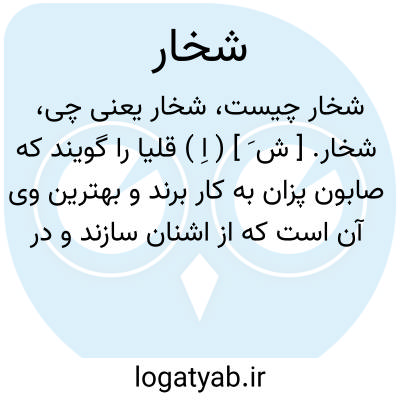 شخار. [ ش َ ] ( اِ ) قلیا را گویند که صابون پزان به کار برند و بهترین وی آن است که از اشنان سازند و در وی خواص عجیبه بسیار است. ( برهان ). اشخار. ( جهانگیری ). قلیا باشد که صابون گران به کار برند. ( فرهنگ سروری ). آنچه رنگ رزان و گازران به کار برند. به هندش سیاحی نامند. ( شرفنامه منیری ). قلیه سنگ،یعنی چیزی باشد که گازران بدان جامه شویند و صابون پزان و رنگریزان بکار دارند. ( لغتنامه اسدی نسخه مدرسه سپهسالار ). قلیا که از اشنان گیرند و در صابون پزی بکار برند. ( ناظم الاطباء ). نام خاکستری است که از سوزاندن ساقه گیاه اشنیان ( از تیره اسفناجیان ) به دست می آید که مواد قلیائی زیاد دارد و در صابون سازی به کار میرود. ( گیاه شناسی گل گلاب ص 274 ):