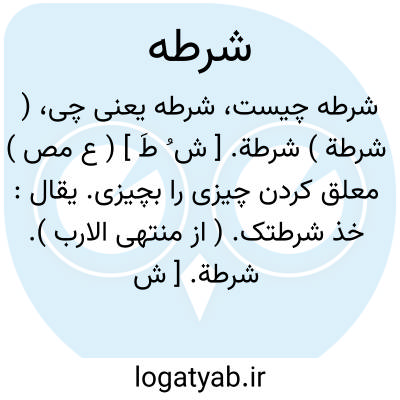 ( شرطة ) شرطة. [ ش ُ طَ ] ( ع مص ) معلق کردن چیزی را بچیزی. یقال: خذ شرطتک. ( از منتهی الارب ).
