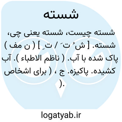 شسته. [ ش ُ ت َ / ت ِ ] ( ن مف ) پاک شده با آب. ( ناظم الاطباء ). آب کشیده. پاکیزه. ج، ( برای اشخاص ). شستگان. ( فرهنگ فارسی معین ). مغسولة. مغسول. رحیض. مرحوض. ( یادداشت مؤلف ). غسیل. غِسّیل. ( منتهی الارب ). مغسول. ( منتهی الارب ):