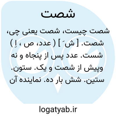 شصت. [ ش َ ] ( عدد، ص، اِ ) شست. عدد پس از پنجاه و نه وپیش از شصت و یک. ستون. ستین. شش بار ده. نماینده آن در ارقام هندیه 60 و در حساب جمل «س » باشد. ( یادداشت مؤلف ). شش دفعه ده. ( ناظم الاطباء ):