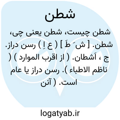 شطن. [ ش َ طَ ] ( ع اِ ) رسن دراز. ج، اَشطان. ( از اقرب الموارد ) ( ناظم الاطباء ). رسن دراز یا عام است. ( آنندراج ) ( منتهی الارب ). حبل. ( المصادر زوزنی ). ریسمان. نخ. رشته. ریسمان دراز. ( یادداشت مؤلف ). رسن. ( مهذب الاسماء ). رسن دراز. ( غیاث اللغات ):
