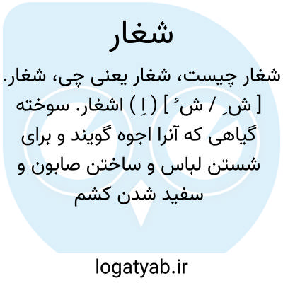 شغار. [ ش ِ / ش ُ ] ( اِ ) اشغار. سوخته گیاهی که آنرا اجوه گویند و برای شستن لباس و ساختن صابون و سفید شدن کشمش بکار برند ( در خراسان بخصوص در گناباد )، و ناصرخسرو آنرا شخار آورده: