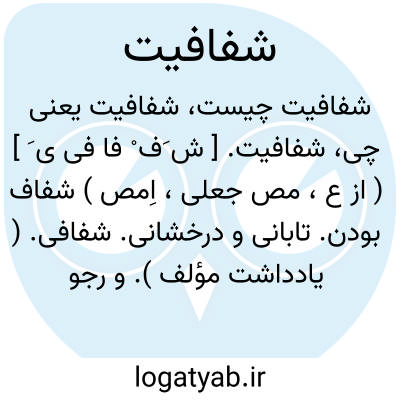 شفافیت. [ ش َف ْ فا فی ی َ ] ( از ع، مص جعلی، اِمص ) شفاف بودن. تابانی و درخشانی. شفافی. ( یادداشت مؤلف ). و رجوع به شفاف و شفافی شود.