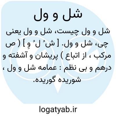 شل و ول. [ ش ُ ل ُ وِ ] ( ص مرکب، از اتباع ) پریشان و آشفته و درهم و بی نظم: عمامه شل و ول، شوریده گوریده. ( یادداشت مؤلف ). چیزی که اجزای آن کاملاً بایکدیگر ارتباط محکم نداشته باشد. لباسی که برای تن کسی گشاد باشد و بر تن او آویزان شود و نظایر و اشباه آن. ( فرهنگ لغات عامیانه ). || بی حال. آنکه مواظب درست نگاه داشتن جامه های خود بر تن نیست. ( یادداشت مؤلف ). سست. وارفته. ( فرهنگ فارسی معین ).