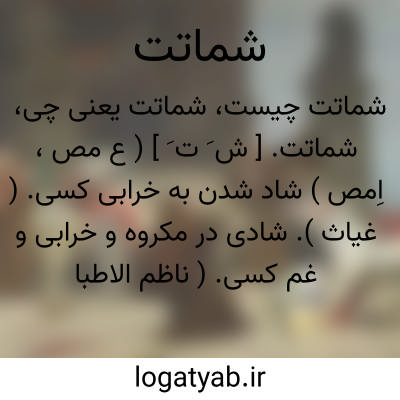 چون خزان بینم نیسان اسد.خاقانی.|| دشمن کامی. ( فرهنگ فارسی معین ). رجوع به شماتة شود. || سرزنش. ( ناظم الاطباء ) ( فرهنگ فارسی معین ). سرزنش کردن. ( فرهنگ فارسی معین ). ملامت. سرکوفت. بیغاره. ( یادداشت مؤلف ): باز از شماتت اعدا می اندیشم. ( گلستان ). یکی نقصان مایه و دیگر شماتت همسایه. ( گلستان ). || غوغا. شور. فریاد. گیرودار. هنگامه. ( ناظم الاطباء ).