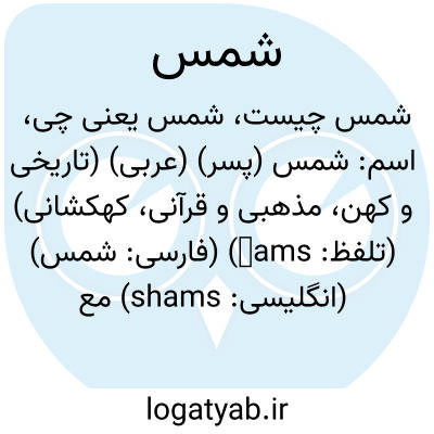 معنی: خورشید، آفتاب، نام نود و یکمین سوره در قرآن کریم، ( اَعلام ) ) سوره ی نود و یکم از قرآن کریم دارای پانزده آیه، ) شمس تبریزی: ( شمس الدین محمّدابن علی ) [حدود، حدود قمری] صوفی و عارف ایرانی، که دیدارش در مولوی [ هجری] تأثیر شگرفی داشت و مولوی دیوان شمس را به نام او سروده است، ) شمس فخری: [قرن هجری] دایرة المعارف نویس و ادیب ایرانی، مؤلف معیار جمالی، ) شمس قیس رازی: ( شمس الدین محمّدابن قیس [زنده در هجری]، ادیب ایرانی، که از هجری در شیراز می زیست، مؤلف المعجم فی معاییر اشعارالعجم، درباره ی شعر فارسی، ) شمس مغربی ( محمّد شیرین ) [قرن و هجری]، عارف و شاعر ایرانی از مردم تبریز، مؤلف کتابهایی در عرفان، نام بتی در قدیم، نام سوره ای در قرآن کریم