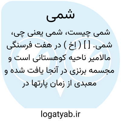 شمی. [ ] ( اِخ ) در هفت فرسنگی مالامیر ناحیه کوهستانی است و مجسمه برنزی در آنجا یافت شده و معبدی از زمان پارتها در آن مکان کشف گردیده که تقریباً در ایران بی سابقه است. این مکان در میان کوههای بلند واقع است و مردم بختیاری چندین مجسمه بزرگ و کوچک از آن بیرون آورده اند. این جلگه تا ده شمی پنج میل مسافت دارد. ( از جغرافیای غرب ایران ص 313 ).