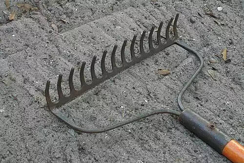 وسیله ای دسته دار با دندانه های فلزی برای هموار ساختن زمین.