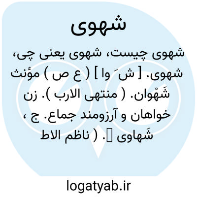 شهوی. [ ش َ وا ] ( ع ص ) مؤنث شَهْوان. ( منتهی الارب ). زن خواهان و آرزومند جماع. ج، شَهاوی ̍. ( ناظم الاطباء ) ( از اقرب الموارد ). رجوع به شهوان شود.