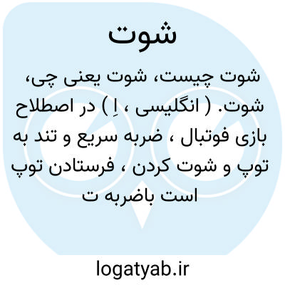 شوت. ( انگلیسی، اِ ) در اصطلاح بازی فوتبال، ضربه سریع و تند به توپ و شوت کردن، فرستادن توپ است باضربه تند و محکم به سوی دروازه. توپ تیزی که بازیکن با پا و ضربه شدید به سوی «گُل » زند. || ندرتاً بمعنی «دم » و «پک » استعمال شود، مثلاً شوت چپق زدن، بمعنی کشیدن چپق و دود گرفتن و پک زدن بدان مورد استعمال دارد. ( از فرهنگ عامیانه جمال زاده ).