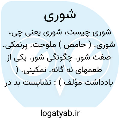 شوری. ( حامص ) ملوحت. پرنمکی. صفت شور. چگونگی شور. یکی از طعمهای نه گانه. نمکینی. ( یادداشت مؤلف ):