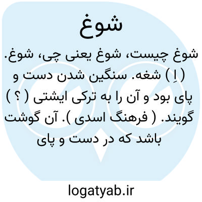 شوغ. ( اِ ) شغه. سنگین شدن دست و پای بود و آن را به ترکی ایشتی ( ؟ ) گویند. ( فرهنگ اسدی ). آن گوشت باشد که در دست و پای سخت شده باشد چون چرم. ( فرهنگ اسدی ). ستبری باشد در پوست. ( نسخه دیگر اسدی ). آن پوست بود که بر تن مردم سخت شده باشد از کار کردن برنج و شغه نیز گویند. ( حاشیه فرهنگ اسدی ). شوخ. ( انجمن آرا ) ( از آنندراج ). پینه دست و پا که از کار کردن یا از تردد بهم رسیده باشد ودر نسخه شمس فخری شغه نیز به این معنی است. ( از ادات الفضلاء ). پینه. شغ. پینه و آبله را گویند که بر دست و پا بسبب کار کردن و راه رفتن به هم رسد. ( برهان ). پوست اندام آدمی که بسبب کثرت کار سخت شود و آن راپینه نیز خوانند. ( فرهنگ جهانگیری ). آن پوست که بر تن سخت شده باشد از کار کردن و درد نکند و آن را شغه نیز گویند. ( صحاح الفرس ). پوست سختی باشد که بر اندام پدید آید از غایت کار کردن یا از رفتن پیاده پا سطبر شود و بر دست و پای شتر باشد. ( اوبهی ). پینه یعنی ستبری که بر دست و پای و پیشانی آدمی و زانوی شتر و جز آن بندد از فرط کار و سایش. ( یادداشت مؤلف ). ورجوع به شوخ و مترادفات دیگر کلمه شود: