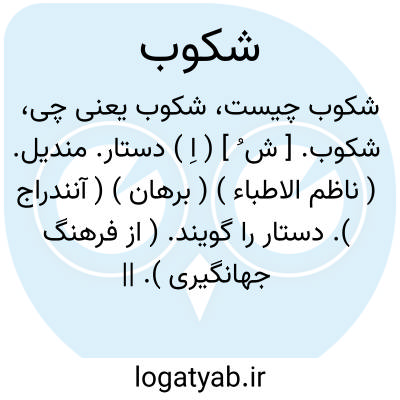شکوب. [ ش ُ ] ( اِ ) دستار. مندیل. ( ناظم الاطباء ) ( برهان ) ( آنندراج ). دستار را گویند. ( از فرهنگ جهانگیری ). || رومال. دستمال. ( ناظم الاطباء ).