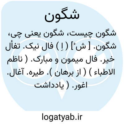 شگون. [ ش ُ] ( اِ ) فال نیک. تفأل خیر. فال میمون و مبارک. ( ناظم الاطباء ) ( از برهان ). طیره. آغال. اغور. ( یادداشت مؤلف ). تفأل گرفتن به آواز و پرواز و جز آن و به صورت شگن هم آمده و این مشترک است در هندی و با لفظ نهادن و گرفتن و کردن مستعمل. ( آنندراج ):