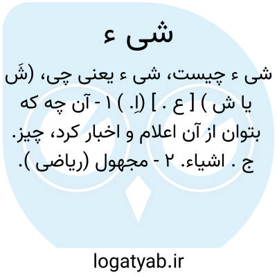 (شَ یا ش ) [ ع. ] (اِ. ) ۱ - آن چه که بتوان از آن اعلام و اخبار کرد، چیز. ج. اشیاء. ۲ - مجهول (ریاضی ).