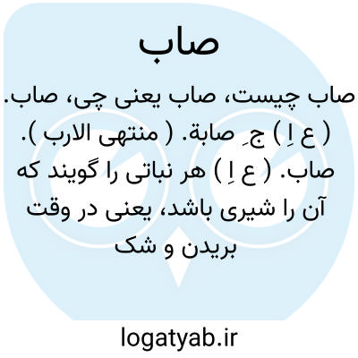 صاب. ( ع اِ ) هر نباتی را گویند که آن را شیری باشد، یعنی در وقت بریدن و شکستن از آن چیزی برآید سفید، مانند شیر. ( برهان قاطع ). || درختی است که چون فشرده شود از او هیئت شیر آبی بیرون آید و اگر قطره ای از آن در چشم افتد، در نظر او چنان نماید که از آسمان شهاب سوی زمین می آید و در هوا درافشان شود و منبت او در اقصای بلاد شام است و طعم او تلخ بود. و ابوعبیده از اصمعی روایت کند که طعم صاب و سلع تلخ است و لیث گوید صاب عصاره درختی است که طعم او تلخ است. ( ترجمه صیدنه ابوریحان ). || گویند قثاءالحمار است، به تحقیق نوعی از یتوعات است. ( اختیارات بدیعی ). و در نسخه ای دیگر از همین کتاب چنین آمده است: صابون الصاره ( بجای صاب ) و پس از آن آرد: گویند قثاءالحمار و گویند به تحقیق نوعی از یتوعات است. || اسم عربی جمیعاشیای بسیار تلخ است و بر قثاءالحمار و بر نوعی از گیاه شیردار بسیار تلخ شامل است. ( تحفه حکیم مؤمن ): از حلاوت مذاق، حلاوت شهد و شکر را در مرارت صاب و صبر یابد. ( جهانگشای جوینی ). || باران ریزان. ( منتهی الارب ). || و به صفاهانی سیب را که تفاح باشد صاب خوانند. ( برهان قاطع ).