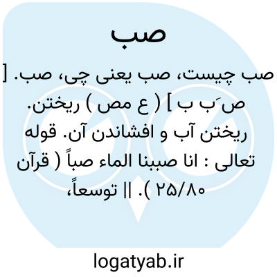 صب. [ ص َب ب ] ( ع مص ) ریختن. ریختن آب و افشاندن آن. قوله تعالی: انا صببنا الماء صباً ( قرآن 25/80 ). || توسعاً، رسیدن مصیبت. فرود آمدن بلا و نازله: