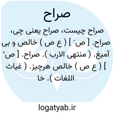 صراح. [ ص ُ ] ( ع ص ) خالص هرچیز. ( غیاث اللغات ). خالص و بی آمیغ از هر چیزی. ( منتهی الارب ). خالص. ( نشوء اللغة ص 140 ) ( مهذب الاسماء ). محض. خالص. غیر مشوب: هر خبط عشوا و قولی بر عمیا کذب صراح و محض افتراء. ( جهانگشای جوینی ).از صراحی خون صراح جوشید و ایشان صراح پنداشتند. ( جهانگشای جوینی ). || کاس ٌ صراح؛ کاس پاکیزه و خالص از آمیختگی. ( منتهی الارب ). || می خالص. ( دهار ). می بی آب. می صافی. ( زمخشری ). || سخن خالص و بی آمیغ. || ( اِ ) اسم است مواجهه را یعنی روی باروی. || ( مص ) رویاروی دشنام دادن کسی را. ( منتهی الارب ). و رجوع به صِراح شود. || ( اِمص ) روشنائی. ( غیاث اللغات ).