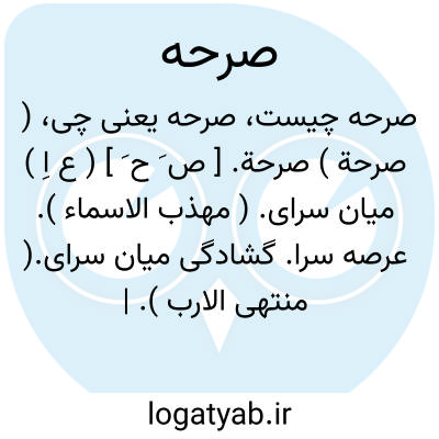 ( صرحة ) صرحة. [ ص َ ح َ ] ( ع اِ ) میان سرای. ( مهذب الاسماء ). عرصه سرا. گشادگی میان سرای.( منتهی الارب ). || ( ص ) بارز و آشکارا: خرج لهم صرحة برحة؛ برآمد بر ایشان ظاهر و نمایان. || زمین استوار و درشت هموار. ( منتهی الارب ).