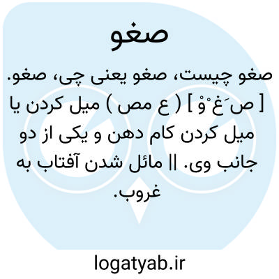 صغو. [ ص َغ ْوْ ] ( ع مص ) میل کردن یا میل کردن کام دهن و یکی از دو جانب وی. || مائل شدن آفتاب به غروب. || مائل شدن نجوم به غروب. || ( اِمص ) میل، یقال: صغوه معک؛ یعنی میل او بسوی تست. ( منتهی الارب ).
