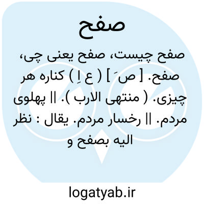 صفح. [ ص َ ] ( ع اِ ) کناره هر چیزی. ( منتهی الارب ). || پهلوی مردم. || رخسار مردم. یقال: نظر الیه بصفح وجهه؛ ای بعرض وجهه. ( منتهی الارب ) ( مهذب الاسماء ). || رخسار شمشیر وپهنای آن. || پهنای هر چیزی. ( منتهی الارب ). پهنا. || صفح الجبل؛ بن کوه یا پائین کوه یا جای هموار از کمر آن و روی کوه. ( منتهی الارب ).برکوه. ( مهذب الاسماء ). || ناحیه، سرزمین. || ( مص ) روی گردانیدن. ( منتهی الارب ). || درگذشتن از کسی. ( منتهی الارب ). درگذشتن ازگناه. ( ترجمان علامه جرجانی ). درگذشتن از خطا. ( غیاث اللغات ). فا گذشتن از جرم. ( مصادر زوزنی ). عفو. تجاوز. ماجری درنوشتن. || اعراض. ( منتهی الارب ). اعراض کردن از کسی یا از چیزی. ( ترجمان علامه جرجانی ) ( مصادر زوزنی ) ( تاج المصادر بیهقی ). || ترک دادن. || ترک کردن. || وارد کردن شتران را بر حوض. || رد کردن سائل را و بازگردانیدن او. ( منتهی الارب ). رد کردن سائل را. ( تاج المصادر بیهقی ). واگردانیدن کسی را از حاجت خویش. ( مصادر زوزنی ). || زدن کسی را به پهنای شمشیر. ( منتهی الارب ). شمشیر به پهنا به کسی زدن. ( تاج المصادر بیهقی ). || سیراب کردن کسی را بنوعی از شراب. || پهن گردانیدن چیزی را. || پیش کردن مردم را یک یک. || نشان دادن ورق را یکی یکی. || نظر کردن در ظاهر کار و نگریستن صفحات آن. ( منتهی الارب ).