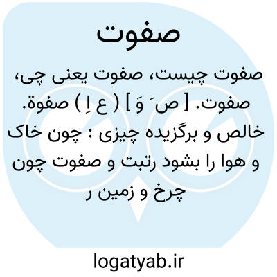 صفوة. [ ص َ / ص ُ / ص ِ وَ ] ( ع اِ ) خالص و برگزیده چیزی. ( منتهی الارب ) ( بحر الجواهر ). برگزیده و آنچه صاف باشد از تیرگی و غش. ( غیاث اللغات ). خالص. ( مهذب الاسماء ). || ( اِمص ) برگزیدگی. ( غیاث اللغات ). بی آمیغی. پاکی. ویژگی. نابی. بی غشی. خلاف کدورت. || ( مص ) خلاصه کردن. ( غیاث اللغات ). || صاف شدن. ( غیاث اللغات ). صافی شدن. ( دهار ).