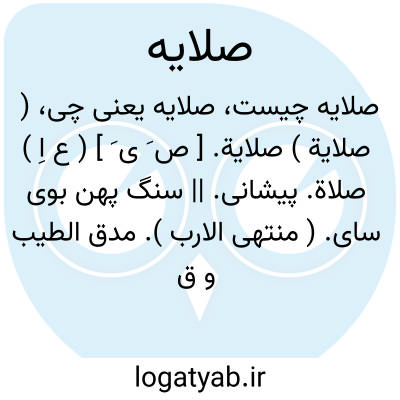 ( صلایة ) صلایة. [ ص َ ی َ ] ( ع اِ ) صلاة. پیشانی. || سنگ پهن بوی سای. ( منتهی الارب ). مدق الطیب و قیل حجر یسحق علیه الطیب او غیره. ج، صُلی و صِلی. ( اقرب الموارد ). سنگی که بدست گرفته دارو سایند و سنگ پهن که بر آن دارو سایند. ( غیاث اللغات ). یکی از دو سنگ که بدان چیزها سایند و سنگ زیرین را فِهر گویند. ( از بحر الجواهر ).الفهر... یستعمل عند الاطباء للحجر الرقیق الذی تسحق به الادویة علی الصلایة. ( اقرب الموارد ):