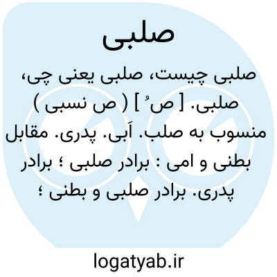 صلبی. [ ص ُ ] ( ص نسبی ) منسوب به صلب. اَبی. پدری. مقابل بطنی و امی: برادر صلبی؛ برادر پدری. برادر صلبی و بطنی؛ برادر ابوینی، برادر پدری و مادری.