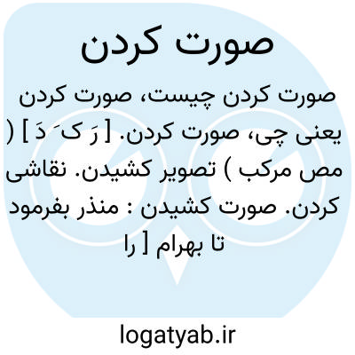 صورت کردن. [ رَ ک َ دَ ] ( مص مرکب ) تصویر کشیدن. نقاشی کردن. صورت کشیدن: منذر بفرمود تا بهرام [ را ] همچنان کمان بزه کشیده بر پشت اسب و آن گور و شیر و تیر اندر زمین همچنان صورت کردند. ( ترجمه تاریخ طبری ). این خانه را از سقف تا به پای زمین صورت کردند. ( تاریخ بیهقی ). بر این جمله که بر حاشیه این ورقه صورت کرده آمده است. ( فارسنامه ابن بلخی ). خال دعاگوی زین الدین مینوشت و جمال نقاش اصفهانی آنرا صورت میکرد. ( راحةالصدور راوندی ).
