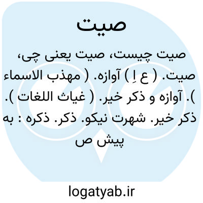 صیت. ( ع اِ ) آوازه. ( مهذب الاسماء ). آوازه و ذکر خیر. ( غیاث اللغات ). ذکر خیر. شهرت نیکو. ذکر. ذکره: