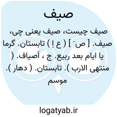 صیف. [ ص َ ] ( ع اِ ) تابستان. گرما یا ایام بعد ربیع. ج، اَصیاف. ( منتهی الارب ). تابستان. ( دهار ). موسم تابستان بمعنی ایام گرما. ( غیاث اللغات ). تابستان. ( ترجمان علامه جرجانی ). و صیف صائف مبالغه است، یعنی تابستان گرم. ( منتهی الارب ):