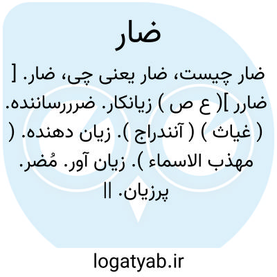 ضار. [ ضارر ]( ع ص ) زیانکار. ضرررساننده. ( غیاث ) ( آنندراج ). زیان دهنده. ( مهذب الاسماء ). زیان آور. مُضر. پرزیان. || نامی از نامهای خدای تعالی. ( مهذب الاسماء ).