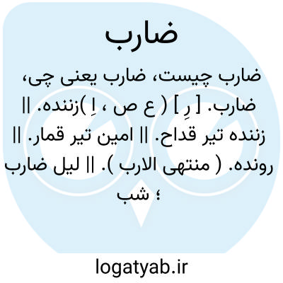 زننده یا زننده تیر قداح یا امین نیر قمار یا رونده یا لیل ضارب شب سخت تاریک شب که تاریکی آن همه اطراف را پوشد یا ناقه لگد زننده وقت دوشیدن یا شتر ماده که دم را برداشته بر شرم خود زنان رود ضاربه مثله یا ضارب السلم و هو شجر مجنمع من المسلم و بالیمامه یسمی ضارب یا مرغ طلبکار رزق یا جای پست هموار درختناک یا پاره ای از زمین درشت دراز در زمین نرم زمین فراخ در وادی یا آب راهه و رحبه مانندی در وادی جمع ضوارب یا زننده برنگی از رنگها مائل برنگی جوده الضارب الی البیاض نیکوترین آنست که به سپیدی زند