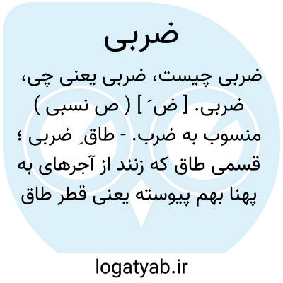 ۱ - منسوب به ضرب. ۲ - نوعی آواز یا آهنگ است که وزن مرتب داشته باشد در قدیم بعضی خوانندگان که ضرب هم می گرفتند و باهنگهای ضربی آشنایی داشتند این نوع آواز را همراه با نواختن ضرب می خواندند باین ترتیب که وزن معینی را در نظر میگرفتند و غزلی را دریک دستگاه میخواندند و گوشه های مهم ردیف را نشان می دادند. وزن آواز ضربی چنانکه هم اکنون معمول است ۶ / ۸ بود. یا آلت ضربی. آلت موسیقی مانند دف و دهل و دو رویه نظیر آنها که بدانها اصول نگاهدارند. یا جلد تیماجی ( چرمی ) ضربی. جلد تیماجی ( چرمی ) که منقوش نباشد. یا طاق ضربی. قسمی که از آجرهای به هم پیوسته از پهنا زنند به طوری که قطر اطاق قطر اقصر آجر است.