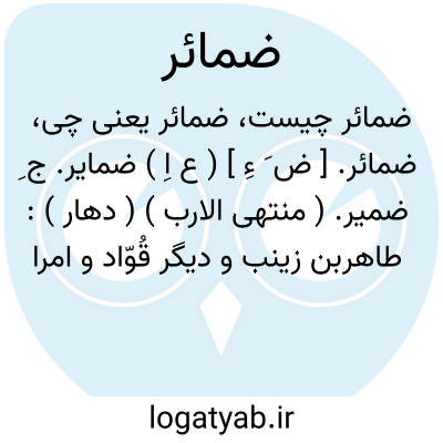 ( اسم ) ۱ - باطن انسان اندرون دل. ۲ - آن چه در خاطر بگذرد اندیشه. ۳ - وجدان. ۴ - سر پنهان راز جمع: ضمایر ( ضمائر ). ۵ - کلمه ای که جای اسم قرار گیرد و دلالت بر شخص یا شئ کند. یا ضمیر اشاره. ضمیریست که کسی یا چیزی را با اشاره نشان دهد و آن دو صیغه دارد: این برای اشاره به نزدیک آن برای اشاره به دور: فریب دشمن مخور و غرور و مداح مخر که این دام زرق نهاده است و آن کام جمع گشاده. توضیح فرق ضمیر اشاره با اسم اشاره آنست که پس از اسم اشاره اسم آید: این خانه آن کتاب ولی ضمیر اشاره تنها استعمال شود. یا ضمیر اضافه. در حالت اضافه آید از این قرار: - م - ت - ش - مان - تان - شان مانند: دخترم دخترت دخترش دخترمان دخترتان دخترشان. یا ضمیر شخصی. ضمیری که یکی از سه شخص را برساند یا به عبارت دیگر دلالت کند بر متکلم مخاطب غایب و آن بر دو قسم است: متصل و منفصل. یا ضمیر فاعلی. از اقسام ضمیر شخصی متصل است و آن دال بر فاعل است از این قرار: - م - ی - د - یم - ید - ند مانند: می روم می روی می رود می رویم می روید می روند. یا ضمیر متصل. ضمیریست که تنها ذکر نشود و آن بر دو قسم است: ضمیر فاعلی ضمیر مفعولی و اضافی. یا ضمیر مشترک. ضمیریست که با یک صیغه در میان تکلم و مخاطب و غایب مشترک باشد و همیشه مفرد استعمال شود مانند: خود خویش خویشتن: من خود آمدم تو خود آمدی او خود آمد... یا ضمیر مفعولی. از اقسام ضمیرشخصی متصل است و آن دال بر مفعول است از این قرار: - م - ت - ش - مان - تان شان مانند: بردم بردت بردش بردمان بردتان بردشان. ( یعنی برد مرا برد ترا... ) یا ضمیر منفصل. ضمیریست که تنها هم ذکر شود از این قرار: من تو او ( وی آن ) ما شما ایشان. توضیح حالات اسم درین ضمایر نیز جاریست مثلا فاعلی: من رفتم تو رفتی... مفعولی: مرا ( من را ) گفت ترا ( تو را ) گفت... اضافی: کتاب من کتاب تو. ۶ - آنست که کسی چیزی اندیشد و بر زبان نیاورد و منجم از روی قواعد احکام نجومی آن را استخراج کند و بگوید که آن نیت حاصل می شود یا نه مقابل خبئ. ۷ - قیاسی بود که کبرایش محذوف باشد و علت حذف یا غایت وضوح بود چنان که گوییم: خط اب و خط اج از یک مرکز به یک محیط شده اند پس متساوی باشند. یا آن که خواهند که کذب مخفی باشد چنان که گویند: فلان شخص به شب طوف می کند پس خائن است. چه به تصریح کبری کذبش ظاهر شود. جمع: ضمایر ( ضمائر ).