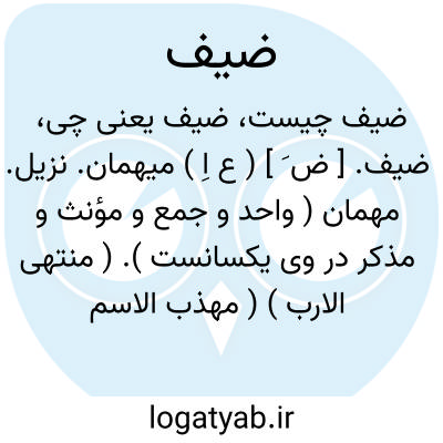 ضیف. [ ض َ ] ( ع اِ ) میهمان. نزیل. مهمان ( واحد و جمع و مؤنث و مذکر در وی یکسانست ). ( منتهی الارب ) ( مهذب الاسماء ). مهمان و میهمانان. ( دهار ). و قد یجمع علی اَضیاف و ضیفان و ضیوف. ( منتهی الارب ):