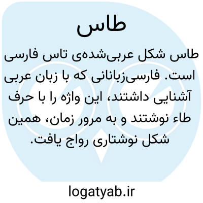 طاس. ( اِ ) در اصل فارسی تاس است، فارسی زبانان عربی دان به طاء نویسند و رواج گرفت، از عالم طپیدن و طلا به معنی طشت کلان و گهری. ( غیاث اللغات ). و در منتخب نوشته ظرفی که درو آب و شراب خورند و هیچ نگفته که معرب است و در شرح نصاب نوشته که: طاس از لغات مولد است یعنی عربی نیست بلکه از آن گرفته اند. ( غیاث اللغات ). ج، طاسات. ( مهذب الاسماء ). پنگان. ( لغتنامه اسدی ). فنجان. اجانة. ظرفی که در آن آشامند. ظرف شراب. جام. آوند شراب. ( دهار ). مکّوک؛ طاس که بدان آب خورند. ( منتهی الارب ). پیاله. تشت. طشت: