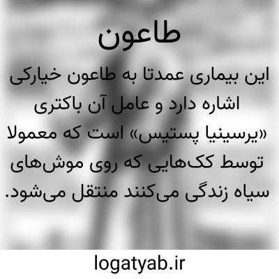 ( اسم ) مرضی عفونی و همه گیر که میکربش در سال ۱۸۹۴ م به وسیله یرسن کشف گردیده و به نام باسیل یرسن نام گذاری شد. این مرض در ایران به حال بومی وجود دارد. باسیل یرسن بیضی شکل است و به شکل کوکو باسیل می باشد. درازیش ۱ تا ۳ میکرن و پهنایش ۱ میکرن است و تنها یا دو یا سه تا جمع میشوند. در رنگ آمیزی بیشتر دو قطب میکرب رنگ میشوند و گرم منفی است و کاملا هوا زی است. در حرارت زود از بین می روند بطوری که در ۶٠ درجه حرارت در مدت نیم ساعت تلف می شوند و نور آفتاب در چند ساعت آن ها را میکشد و ضد عفونیهای معمولی ( مانند محلول سوبلیمه ۱ / ۱٠٠٠ یا اسید فنیک ۱ / ۱٠٠ ) در ظرف چند دقیقه آن را از بین می برد و در روی سطح زمین بیش از چند روز زنده نمی ماند. به طور خلاصه مقاومت باسیل یرسن بجز در بدن انسان و حیوان در جاهای دیگر کم است. در طاعون ریوی میکرب در اخلاط و در طاعون خیارکی در خیارک میکرب فراوان است. مرض طاعون ریوی به وسیله اخلاط و آب دهان مریض به دیگران منتقل می شود و در اواخر مرض نزدیک مرگ نیز چون میکرب در خون مریض فراوان است وسیله کک قابل انتقال است. موش صحرایی در تولید و انتشار این مرض نقش بزرگی دارد و ککهای این موش مرض را به انسان انتقال می دهند. دوره هفتگی مرض طاعون در حدود ۵ روز است. این مرض به سه شکل مهم بالینی: خیارکی و ریوی و سپتی سمیک که ( طاعون سیاه نام دارد ) دیده می شود. در طاعون خیارکی ناراحتی عمومی و حالت تهوع و لرز و سر درد شدید تحمل ناپذیر عارض می شود. به علاوه در ناحیه کشاله ران یا زیر بغل و گاهی در گردن یکی از غده های لنفاوی متورم شده تولید آدنیت چرکی و خیارک می نماید. تب به ۳۹ یا ۴٠ درجه می رسد و مدت ۶ تا ۸ روز به همان وضع باقی می ماند. در حدود ۱۵ تا ۱۸ خیارک باز می شود و حرارت یک دفعه پایین می آید و دوره نقاهت شروع می گردد. گاهی یک تاول زود رس ( تاول طاعونی ) در ۵ درصد بیماران دیده می شود و این تاول محل ورود میکرب را نشان می دهد. نوع سوم طاعون سیاه است که به نام طاعون سپتیسمیک نیز موسوم است. همه گیریهایی که در ۴٠ سال اخیر در ایران پیش آمده از این نوع بوده و با خونریزی انساج همراه است.