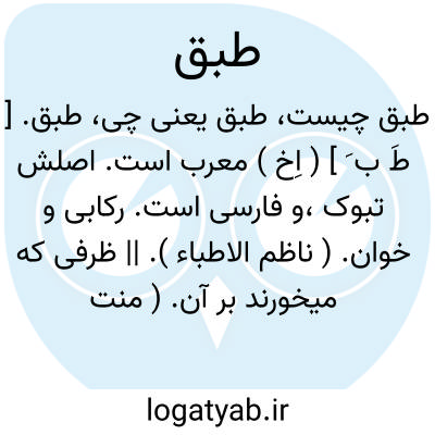 طبق. [ طَ ب َ ] ( اِخ ) معرب است. اصلش تبوک،و فارسی است. رکابی و خوان. ( ناظم الاطباء ). || ظرفی که میخورند بر آن. ( منتهی الارب ). ج، اطباق. ظرف معروف. ( غیاث اللغات ) ( آنندراج ). بشقاب. ظرف پَخ که بر آن طعام خورند. پیشیاره. ( طبق؛ سفر اعداد 7:13 ). بشقاب یا کاسه مانندی بوده است. و بسا میشود که قصد از طبق چینی باشد. ( انجیل متی 14:8 و 11 ). یابشقاب که از یکی از فلزات ساخته شده باشد. ( قاموس کتاب مقدس ). || ظرف مدور پخ و بزرگ از چوب که ظروف یا اشیای دیگری بر وی نهند. پهن مسطح ( بی گودی ) از چوب. ظرف مدور بزرگ که از چوب کرده بی لبه یا با لبه بسیار کوتاه که خوردنی چون توت و انگور بر آن نهاده بر سر حمل کنند. و گاه باشد که اسباب و اثاث خانه بدان برند از جائی به جائی. طبق که از ترکه بید کنند. ظرف چوبین بزرگ بی دیواره: و از وی [ آمل ] آلاتهای چوبین خیزد، چون کفچه و شانه و شانه نیام و ترازوخانه و کاسه و طبق. ( حدود العالم ).
