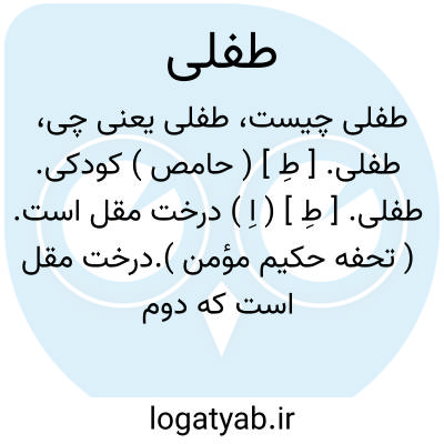 طفلی. [ طَ لی ی / طَ ف َ لی ی ] ( ع ص نسبی ) منسوب به طَفْل یا طَفَل به معنی خاک رس مخصوص. رجوع به دزی ج 2 ص 49 شود.