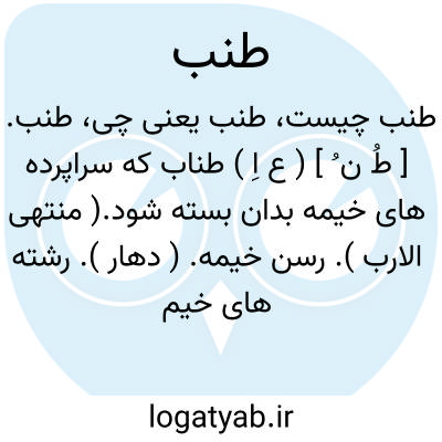 طنب. [ طُ ن ُ ] ( ع اِ ) طناب که سراپرده های خیمه بدان بسته شود.( منتهی الارب ). رسن خیمه. ( دهار ). رشته های خیمه. حبل طوال. ( فهرست مخزن الادویه ). || میخ. ج، اطناب، طنبة. || دوال که به زه کمان پیوندند سپس آن بر چوبک پیچند. دوال که بر قبضه کمان بندند. ( منتهی الارب ). دوال که به چله کمان وصل کنند. ( منتخب اللغات ). || پی اعلای سینه. || بیخ و عروق درخت. ( منتهی الارب ). عِرق شجر. || عصب بدن. ( فهرست مخزن الادویه ). پی اندام. || طرف و ناحیه، و منه الحدیث: ما بین طنبی المدینة احوج منی الیها؛ ای طرفیها. ( منتهی الارب ).