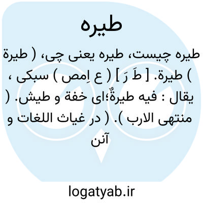 ( طیرة ) طیرة. [ طَ رَ ] ( ع اِمص ) سبکی، یقال: فیه طیرةٌ؛ای خفة و طیش. ( منتهی الارب ). ( در غیاث اللغات و آنندراج طیره را به این معنی با کسر طاء ضبط کرده بنقل از خیابان و برهان و رشیدی و بهار عجم و کشف اللغات و منتخب اللغات ). طیرورة. ( منتهی الارب ):