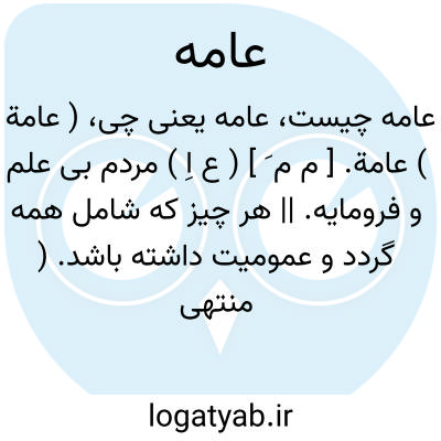 ( عامة ) عامة. [ م م َ ] ( ع اِ ) مردم بی علم و فرومایه. || هر چیز که شامل همه گردد و عمومیت داشته باشد. ( منتهی الارب ) ( ناظم الاطباء ). || چوبهای بهم بسته که بدان از دریا و جوی گذرند و صواب عامَه است. ( منتهی الارب ). || مقابل خاصه. همه مردم. ( منتهی الارب ) ( ناظم الاطباء ). قیامت بدان جهت که همه را فراگیرد. || جماعة و فی حدیث عثمان انّک امام عامة؛ ای امام الجماعة. ( منتهی الارب ). || بیخ دستار.