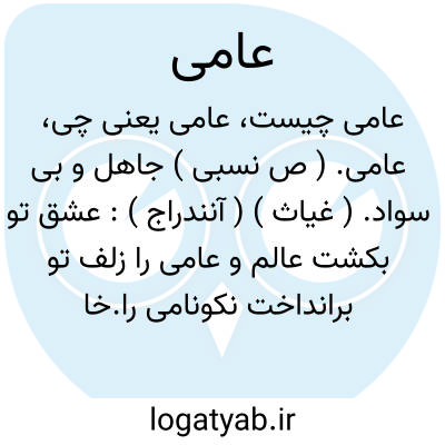 ( صفت ) منسوب به عامه ( مقابل خاصه ) جمع عامیون. ۲ - بی سواد. ۳ - جاهل نادان: عارف و عامی. ۴ - غیر سید مقابل علوی سید: عامی و علوی توضیح این کلمه در اصل به تشدید میم است ولی در فارسی به تخفیف آمده: ای عشق تو کشته عارف و عامی را سودای تو گم کرده نکو نامی را. ( منسوب به بایزید بسطامی ? )