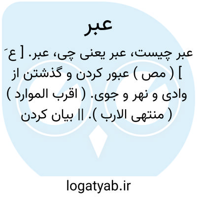 عبر. [ ع َ ] ( مص ) عبور کردن و گذشتن از وادی و نهر و جوی. ( اقرب الموارد ) ( منتهی الارب ). || بیان کردن خواب و خبر دادن مآل کار. ( منتهی الارب ). تعبیرکردن خواب و خبردادن از آنچه پایان بدان می انجامد. ( اقرب الموارد ). تعبیر گفتن خواب. ( غیاث اللغات ). || درگذشتن و مردن. || شکافتن راه را. || جاری کردن اشک. || اندوهگین شدن. ( اقرب الموارد ) ( منتهی الارب ). فریز ناکرده گذاشتن قچها را. ( منتهی الارب ). واگذاشتن پشم را بر قچها در یکسال. ( اقرب الموارد ). || درگذشتن از آب بچیزی. || تأمل کردن در وزن و ماهیت متاع و درهم. ( اقرب الموارد ) ( منتهی الارب ). || با اندیشه خواندن نامه را بدون آواز. ( اقرب الموارد ) ( منتهی الارب ) ( ناظم الاطباء ). || ( اِ ) کنار وادی و ناحیت آن. || ( ص ) مجلس عَبر؛ که مردم بسیار در آن بود. ( اقرب الموارد ).