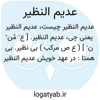 عدیم النظیر. [ ع َ مُن ْ ن َ ] ( ع ص مرکب ) بی نظیر. بی همتا: در عهد خویش عدیم النظیر بود. ( ترجمه ٔیمینی ص 238 ). در فنون آداب و... در سخندانی و سخن آرایی عدیم النظیر و وحیدالدهر است. ( تاریخ قم ص 4 ).