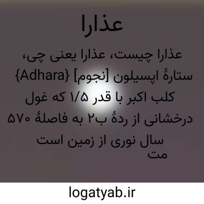 {Adhara} [نجوم] ستارۀ اپسیلون کلب اکبر با قدر 1/5 که غول درخشانی از ردۀ ب2 به فاصلۀ 570 سال نوری از زمین است متـ. اپسیلون کلب اکبر Epsilon Canis Majoris