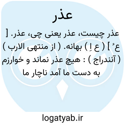 عذر. [ ع ُ ] ( ع اِ ) بهانه. ( از منتهی الارب ) ( آنندراج ): هیچ عذر نماند و خوارزم به دست ما آمد ناچار ما را این خون بباید خواست تا کشنده داماد را بکشیم به خون وملک و میراث بگیریم. ( تاریخ بیهقی چ ادیب ص 690 ).